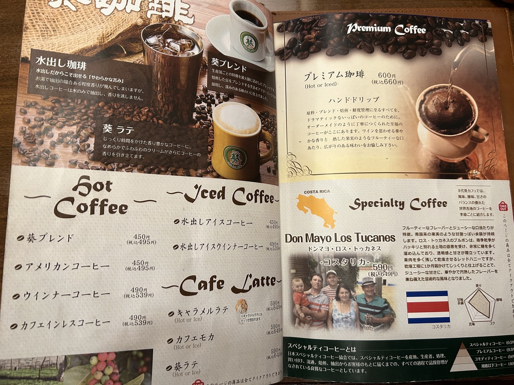 看板メニューの「葵ブレンド」だけでなく、コスタリカ産のスペシャリティコーヒーなど、本格的な一杯が楽しめるようです。味わいのバランスが図解されているので、その日の気分に合わせて「今日はコクのあるものを」と選びやすいのも、コーヒー好きにはうれしいポイントですね。