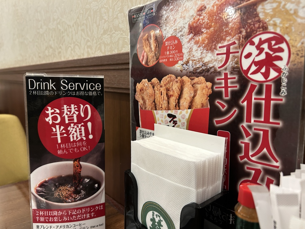 テーブルの上のサービス案内も見逃せませんね。なんと2杯目以降は「お替り半額」といううれしいサービスがあるとのこと!