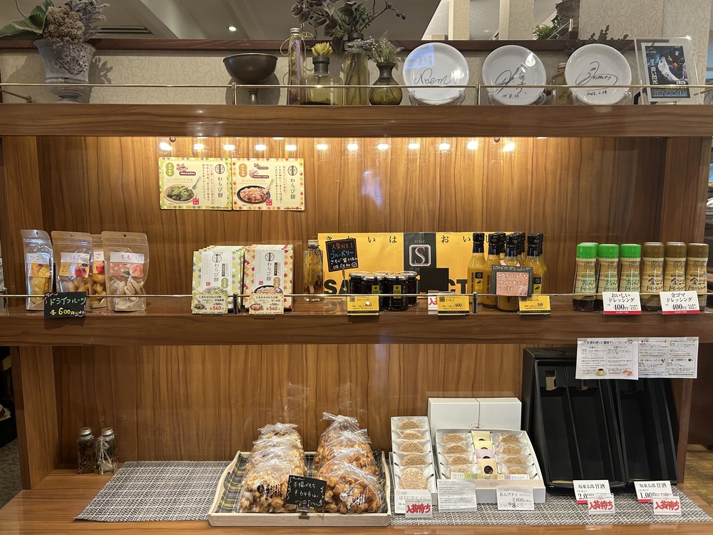 店内レジ横のギフトコーナーも充実しています。わらび餅やドライフルーツ、さらにはこだわりのドレッシングまで並んでいて、見ているだけでも楽しくなりますよ。