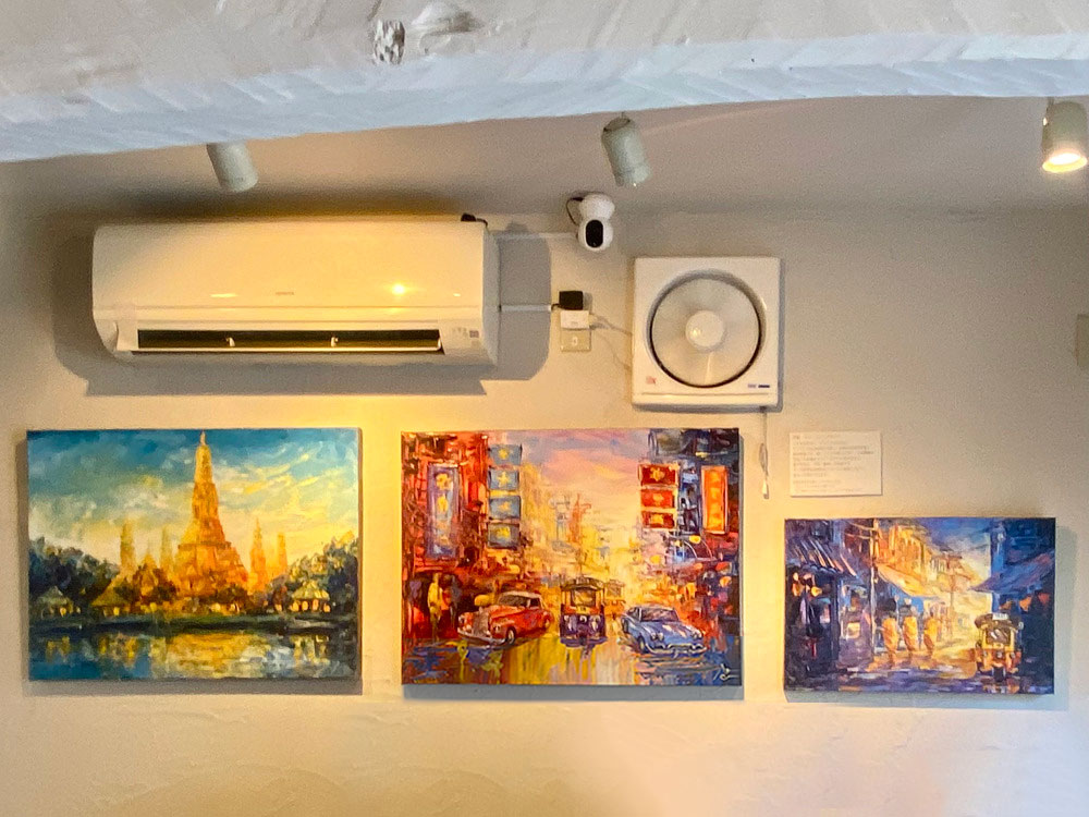 壁に飾られた絵画は色彩が鮮やかで、タイの風景や文化を感じさせるものばかり。