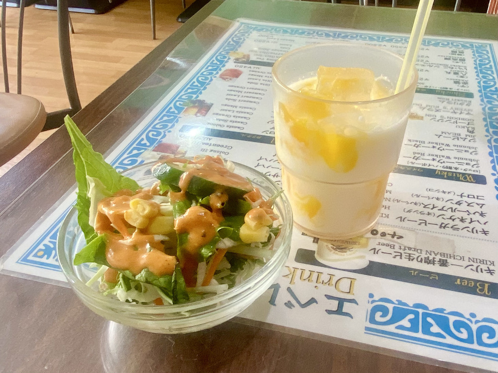 まず先に到着したのが、セットのサラダとドリンクのマンゴーラッシー。