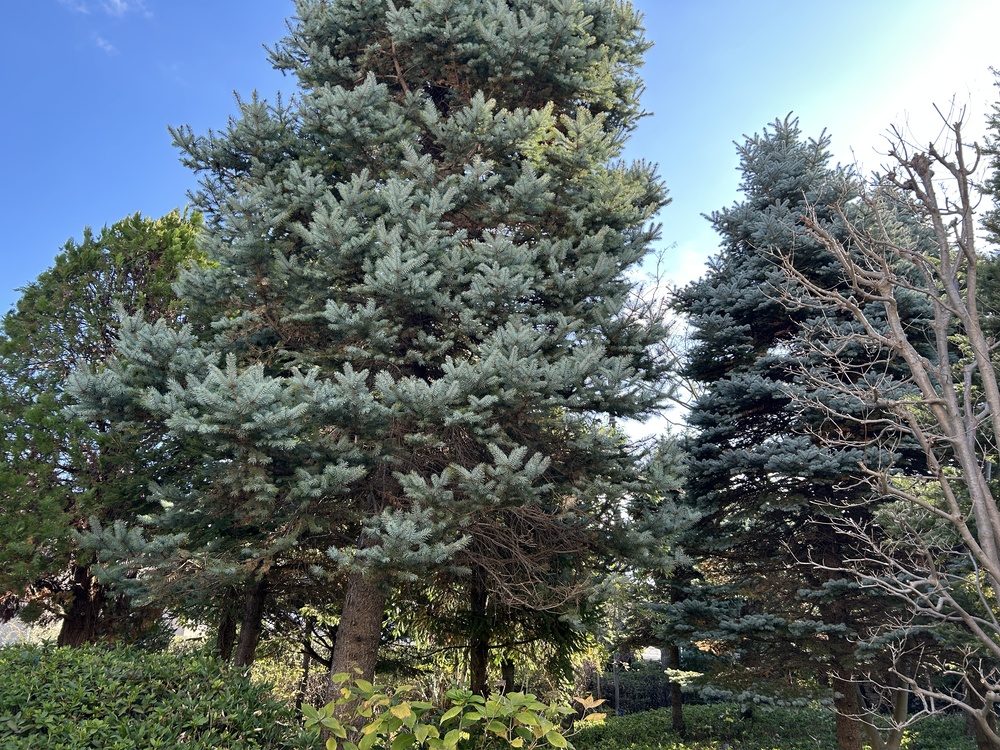 青々とした針葉樹と、手入れの行き届いた低木の緑が重なり合い、奥行きのある美しい景色を作っています。