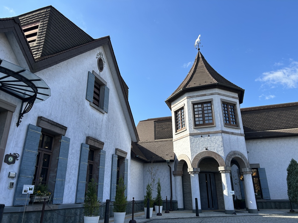 逆光の中に浮かび上がる記念館のシルエットがとても幻想的です。まるでおとぎ話に出てくるお城のようなとんがり屋根と、青い空のコントラストが美しい。魁夷が愛した北欧やドイツの風景を彷彿とさせるこの建築は、建物自体が一つの作品のようです。