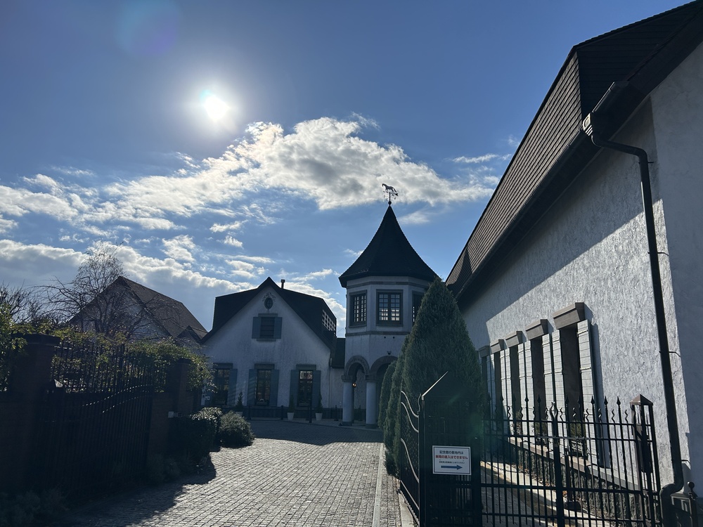 レンガ造りの門柱と、その奥に見える白壁の建物、そして空に向かって伸びる白樺の木々。これらが一体となって、街中にありながら、ここだけ別世界のような静かな空気を醸し出しています。太陽の光が建物全体をやさしく照らし、訪れる人の心を優しく解きほぐしてくれます。