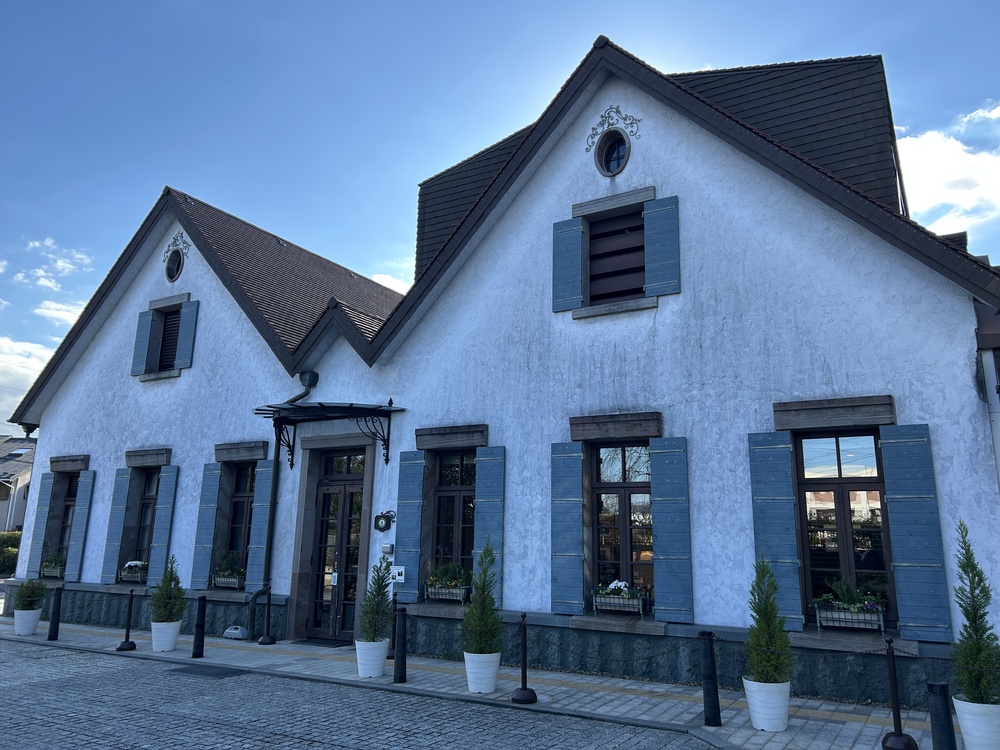 白壁に映える青いよろい戸が、とてもおしゃれでかわいらしい。この外観を見ているだけで、ヨーロッパを旅しているような、そんな気分にさせてくれます。