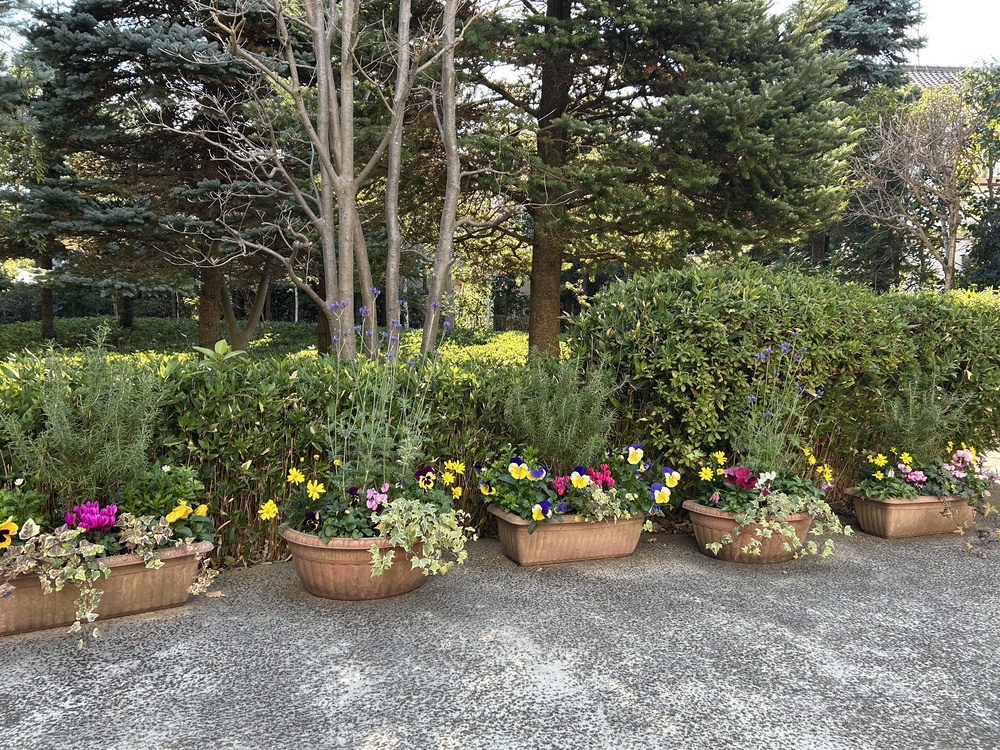 いろとりどりの花々が仲良く並んだ寄せ植えが、秋冬の庭を明るく飾っています。