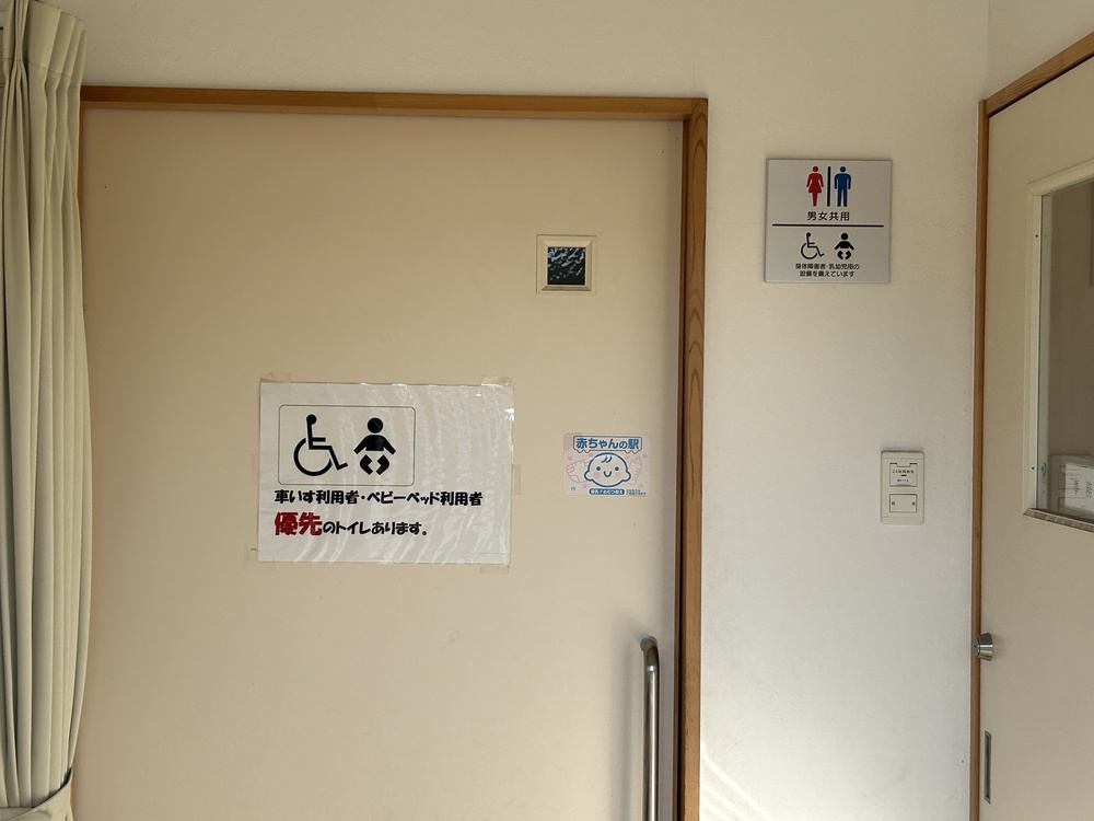 施設内にあるトイレです。車椅子利用者やベビーベッド利用者向けの優先利用を示す案内が掲示されています。多目的トイレとして男女共用として利用することもできます。