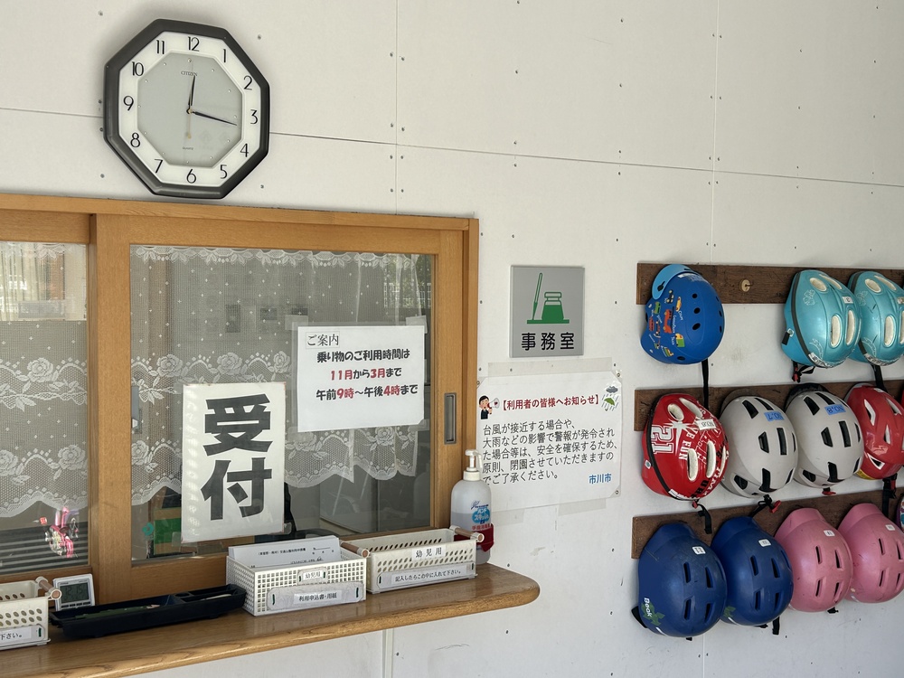受付横の棚には、子ども用のヘルメットがずらりと並び、安全に遊べる準備が整っていますよ。