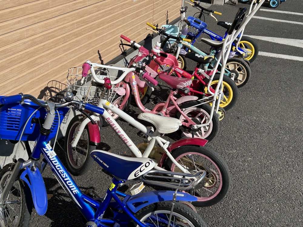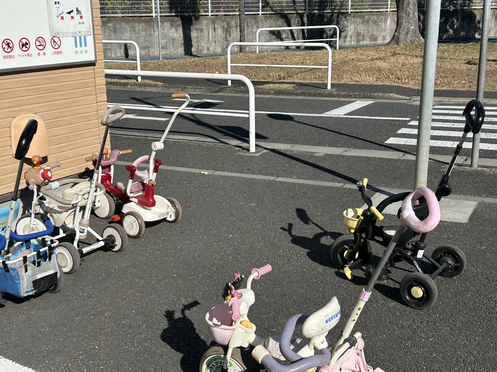 まだ自転車に乗るのが難しい小さな子ども向けの三輪車や手押し車が並んでいます。