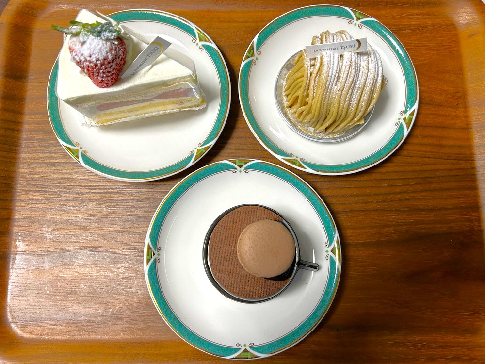 大きな苺がのった王道のショートケーキ、お店で一番人気の和栗のモンブラン、そしてマカロンがのったプラリネショコラのケーキです。どれも食べるのがもったいないくらいきれいです。お気に入りのティーカップを用意して、ゆったりとした時間を過ごすのに最高のラインナップです。