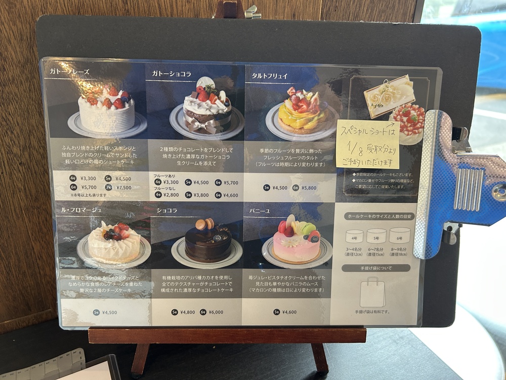 定番のイチゴケーキから、濃厚ガトーショコラ、彩り豊かなフルーツタルトまで、どれも本当においしそう!サイズや人数の目安も分かりやすく記載されているので、お誕生日や記念日の予約にも選びやすいです。