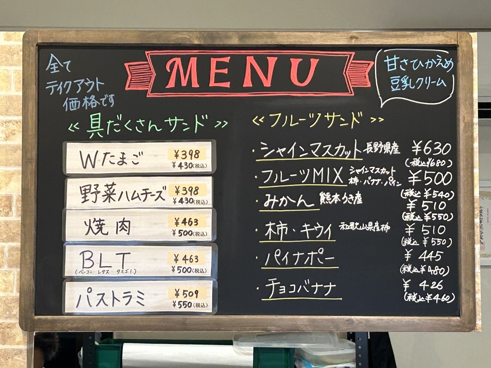 平日は具だくさんサンド4種とデニッシュサンド、土曜日は豆乳クリームのフルーツサンド中心で、具だくさんサンドもあります。