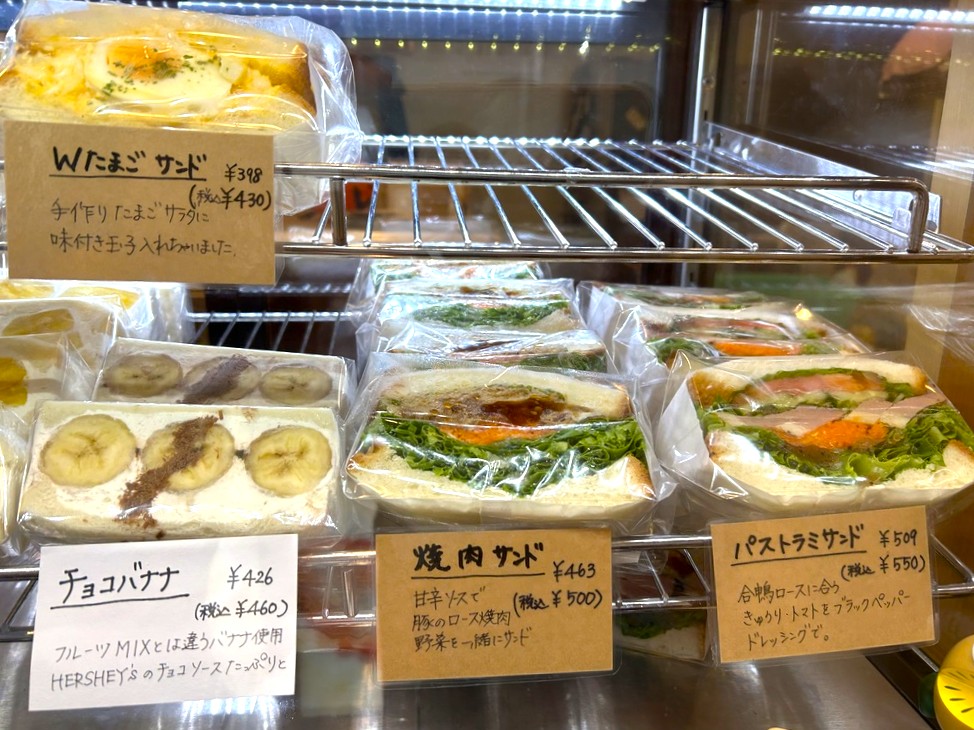 ショーケースには、サンドイッチやフルーツサンドが並んでいます。