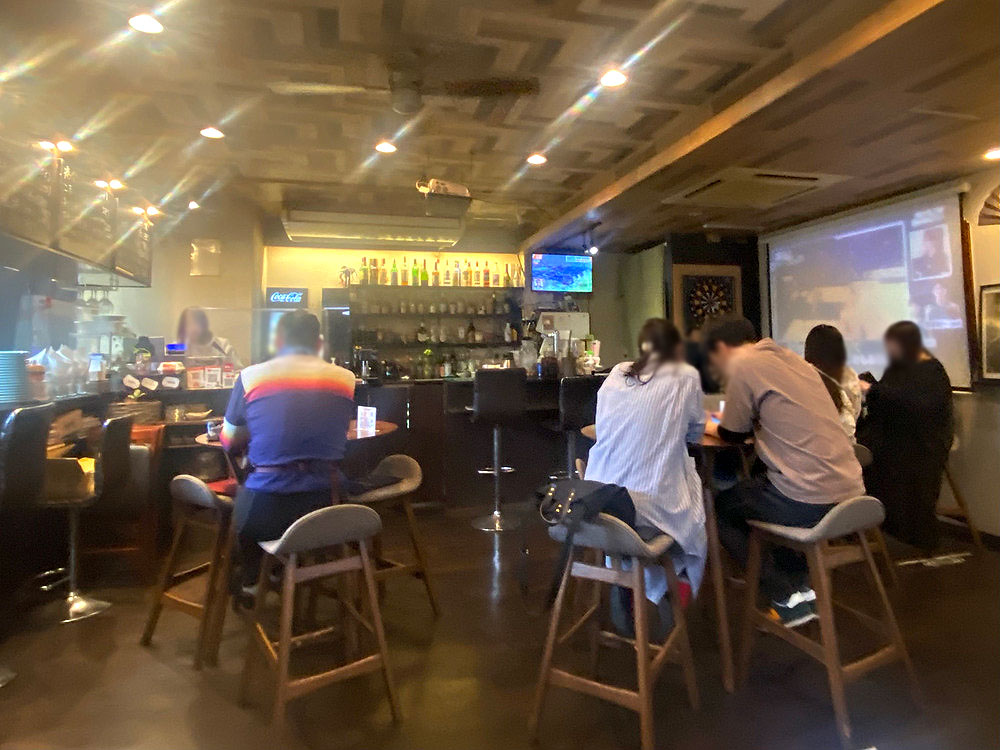 扉の先は、どことなく異国感のあるカジュアルなバーのような店内です。プロジェクターやダーツもあり、シックで落ち着いた空間が広がります。