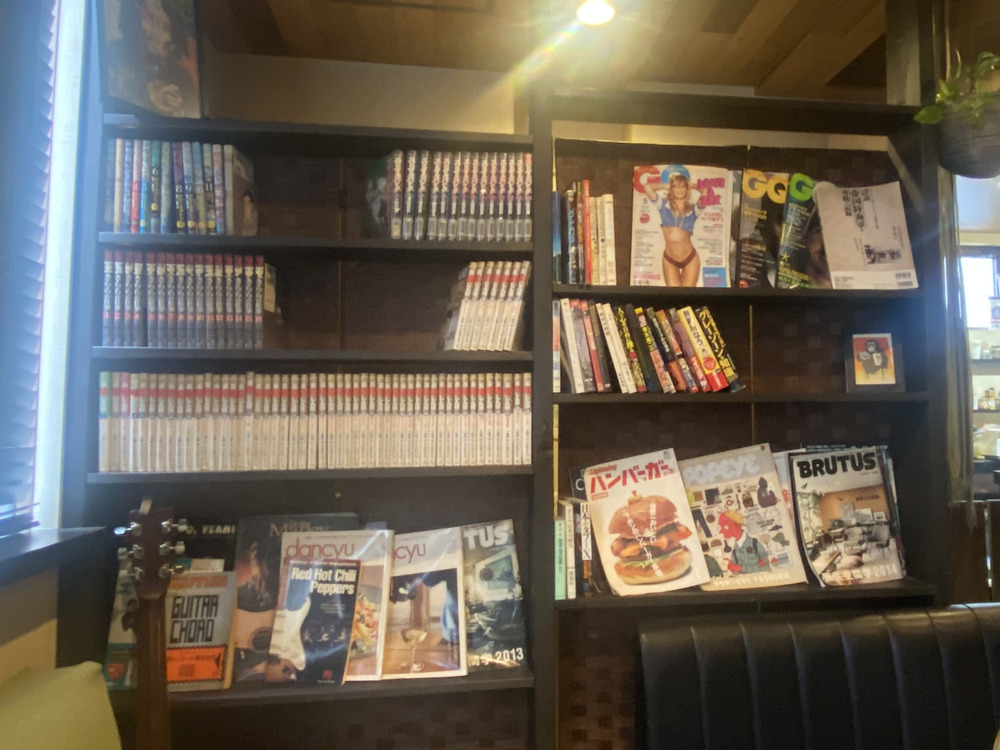 本や漫画、雑誌が並んでいて、料理を待つ時間も退屈しません。