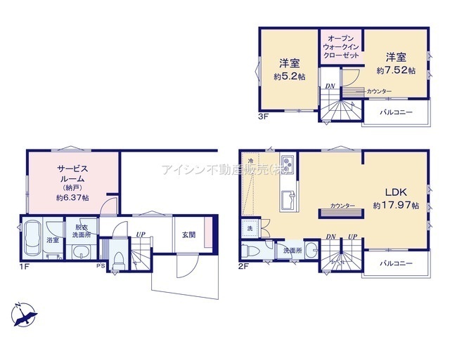 | 間取り詳細 | LDK17.97帖、洋室7.52帖、洋室5.2帖、S6.37帖 | ||