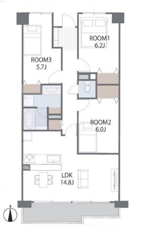 | 間取り詳細 | LDK14.8帖、洋室6.2帖、洋室6帖、洋室5.7帖 | ||