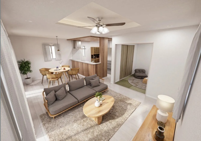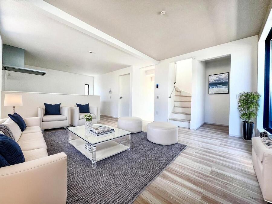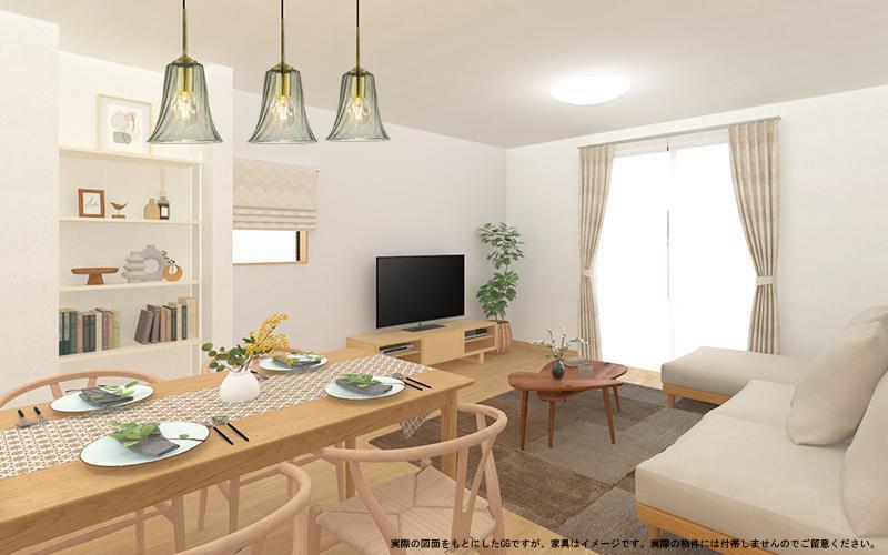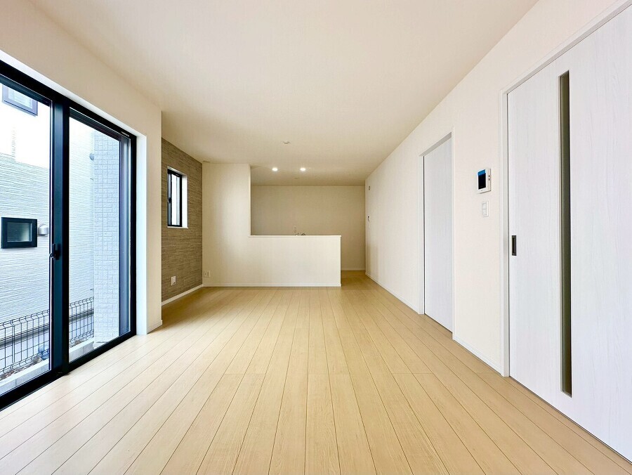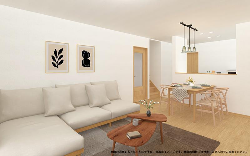 穏やかな住環境×生活便利施設充実の立地 室内物干し金物がついた家事室有の家事応援プラン 壁や天井は白で統一されており、LDK全体が明るく、シンプルで統一感のある...