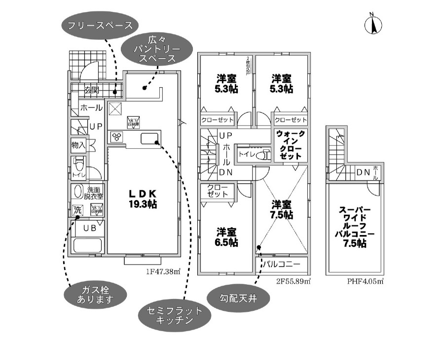 1号棟 完成済み・内覧可能 カースペース並列2台 4LDK+7.5帖ルーフバルコニー 広々パントリー・WIC・玄関フリースペース等収納豊富 タカラスタンダードの...