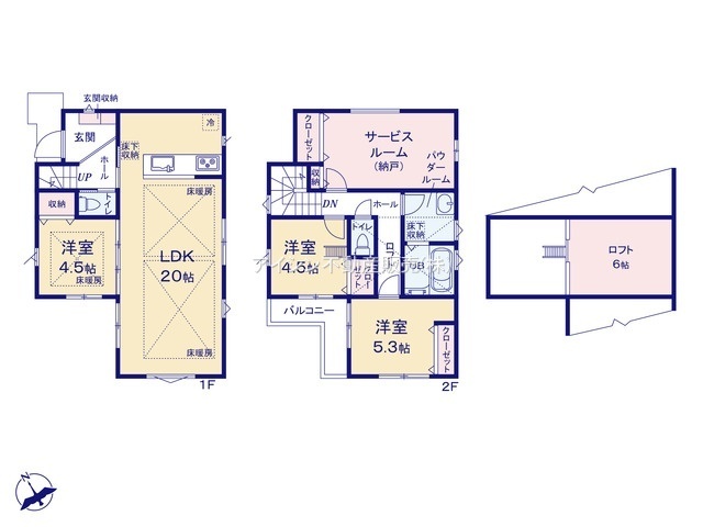 LDKは広々20帖♪ リビングダイニング・1階居室に床暖房完備 家事の時短が叶う食洗器付き 2階のサービスルームは居室や収納、ライフスタイルに応じて使えます ...